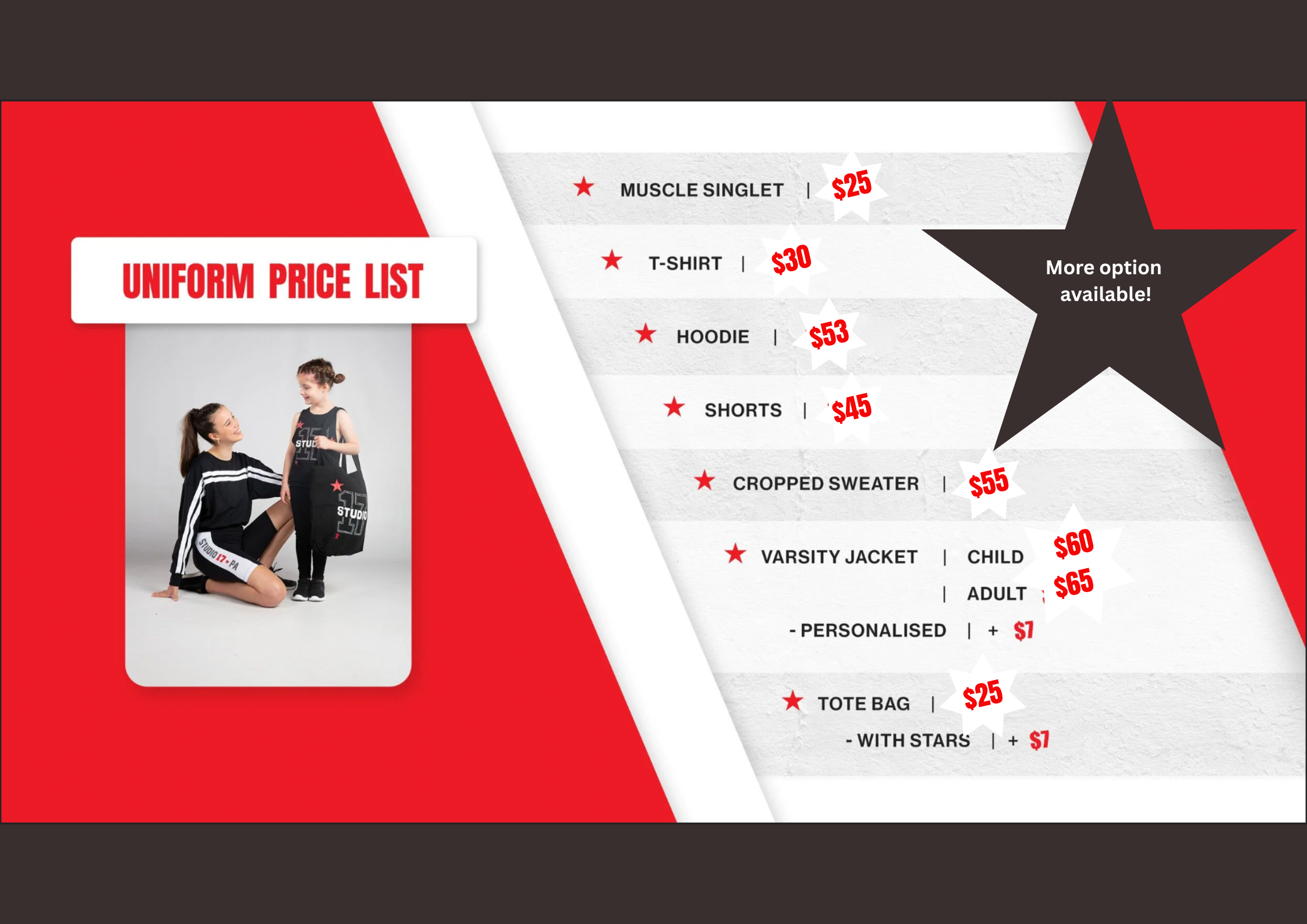 "We love seeing the kids wearing the Studio 17 uniform at Broadway Shopping Centre on Saturdays, we even see kids wearing the uniform on their days off! We love how the uniform is worn everywhere in our community!"